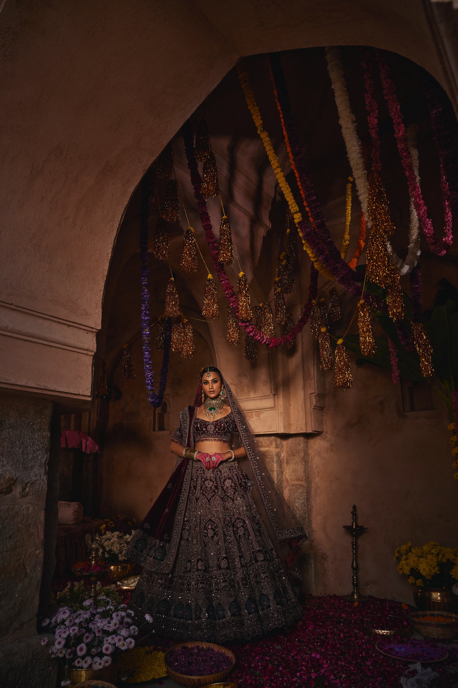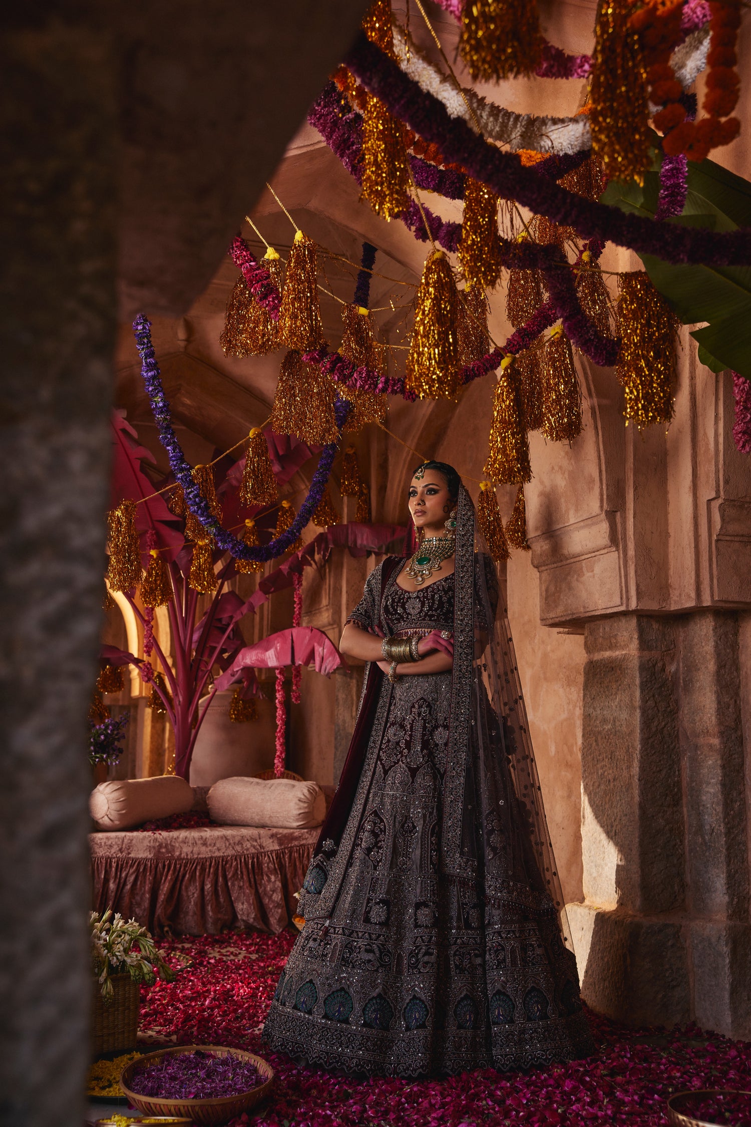 This luxurious lehenga showcases intricate hand embroidery in antique gold and zari detailing, set on a rich deep maroon base that symbolizes tradition, love, and celebration. The heavily embroidered lehenga is paired with a complementing blouse and a soft net dupatta, finished with detailed borders that enhance its regal appeal.