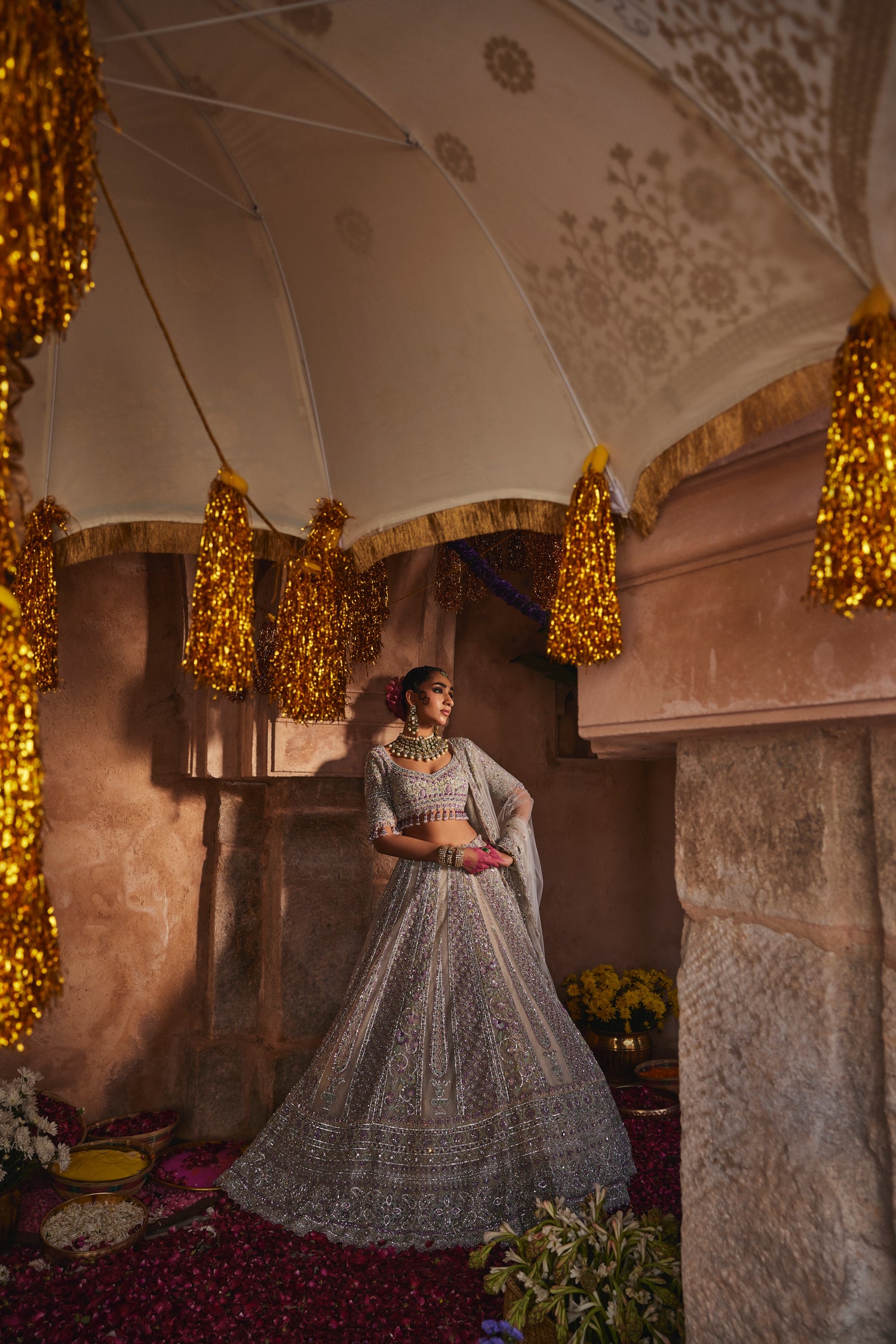 This lehenga features delicate hand embroidery with fine sequin and zari detailing, layered over a soft pastel base that reflects understated luxury. The structured blouse is intricately worked to complement the flowing lehenga, while the sheer dupatta adds a graceful finish to the ensemble.
