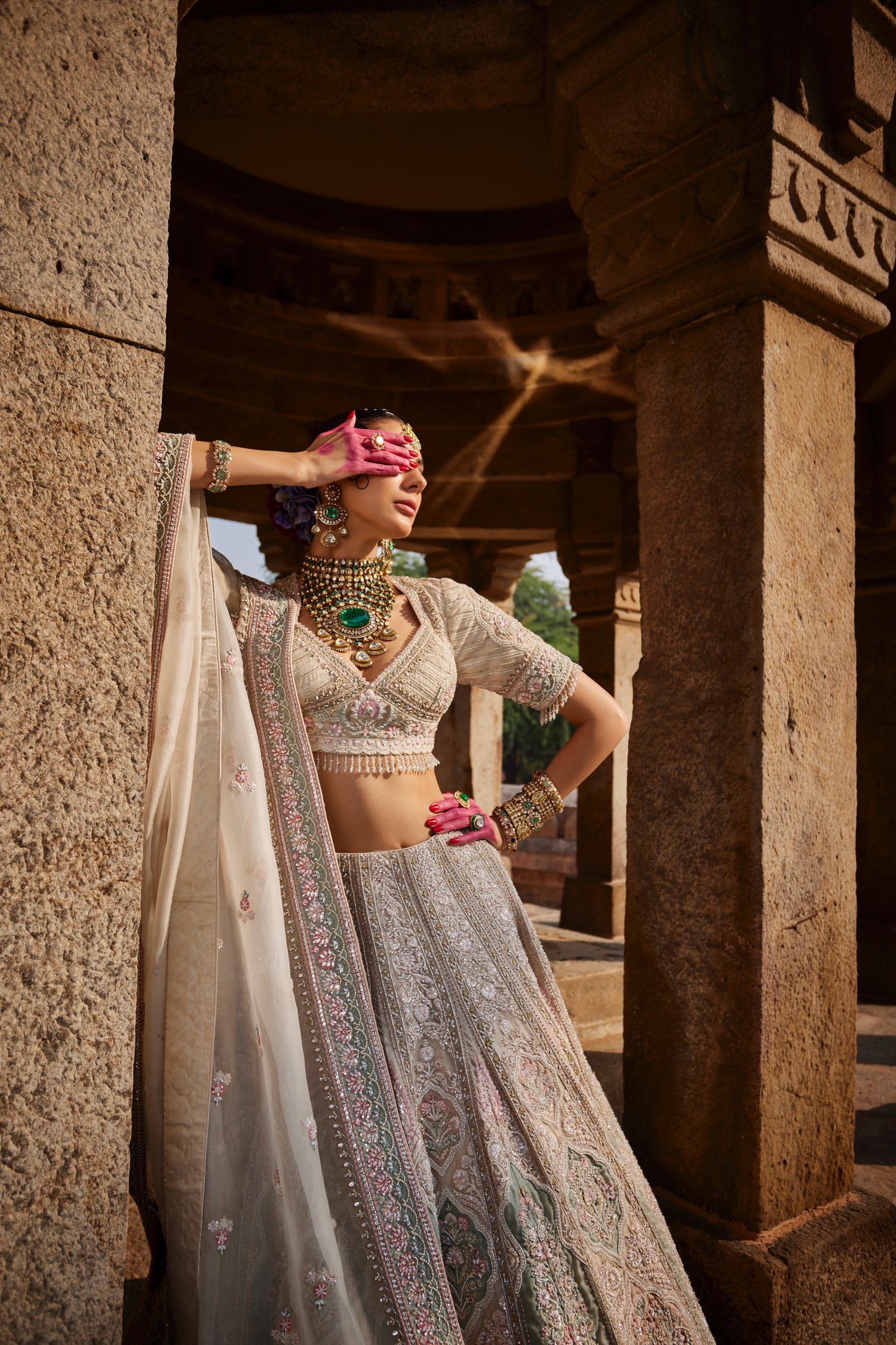 Intricate hand embroidery flows across the lehenga in delicate floral and traditional motifs, highlighted with subtle pastel accents that catch the light beautifully. The deep-neck blouse is richly worked yet refined, perfectly balanced to complement the graceful fall of the skirt. Finished with a sheer dupatta edged in fine embroidery, this lehenga feels timeless, regal, and effortlessly bridal.