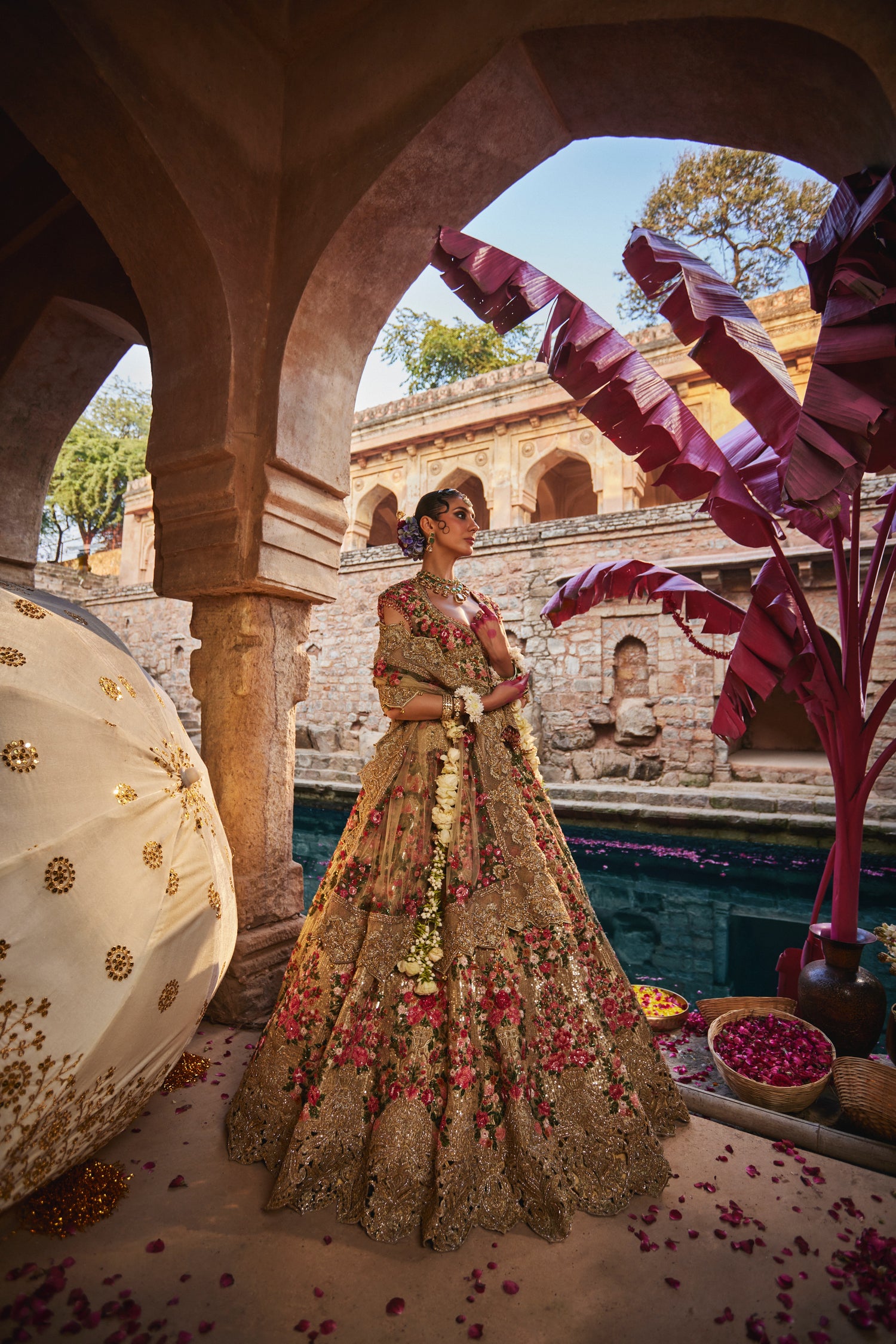 Celebrating the richness of Indian heritage, Vasant Virasat Lehenga is a poetic blend of nature, tradition, and couture craftsmanship. Crafted on a muted gold base, the lehenga is adorned with intricate floral hand embroidery in jewel tones, evoking the beauty of royal gardens and ceremonial courtyards. Delicate detailing, layered textures, and a graceful silhouette come together to create an ensemble that feels both timeless and opulent. Designed for brides who seek understated grandeur, this piece is a tribute to elegance rooted in tradition.