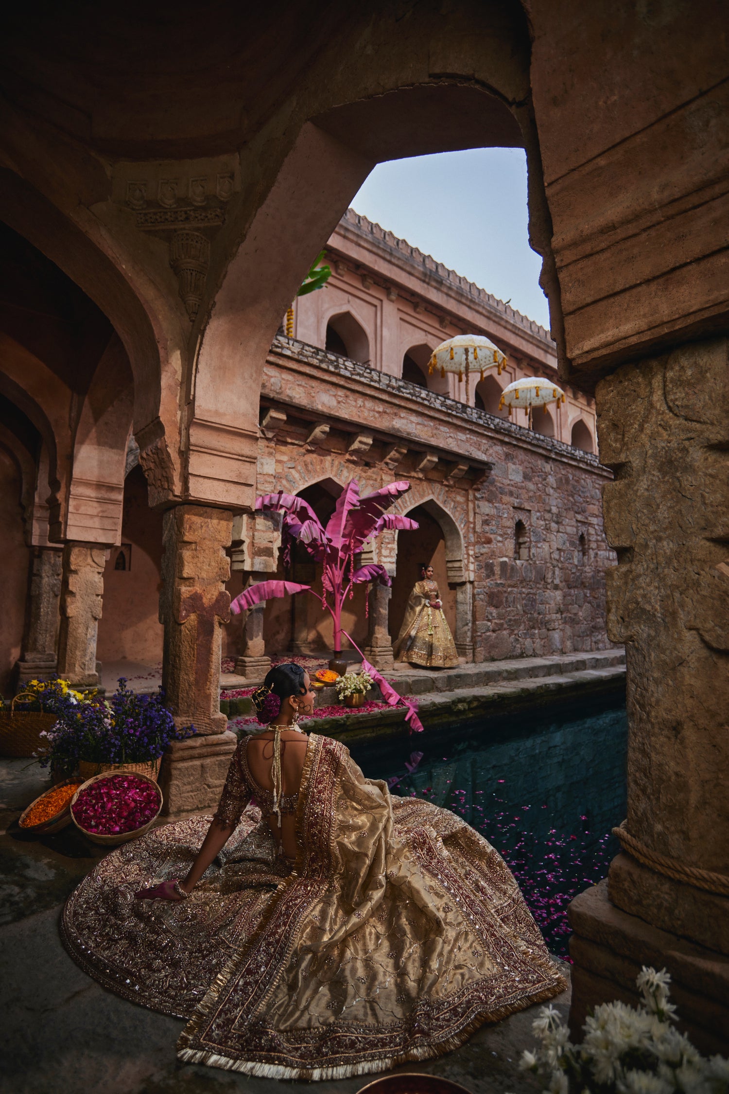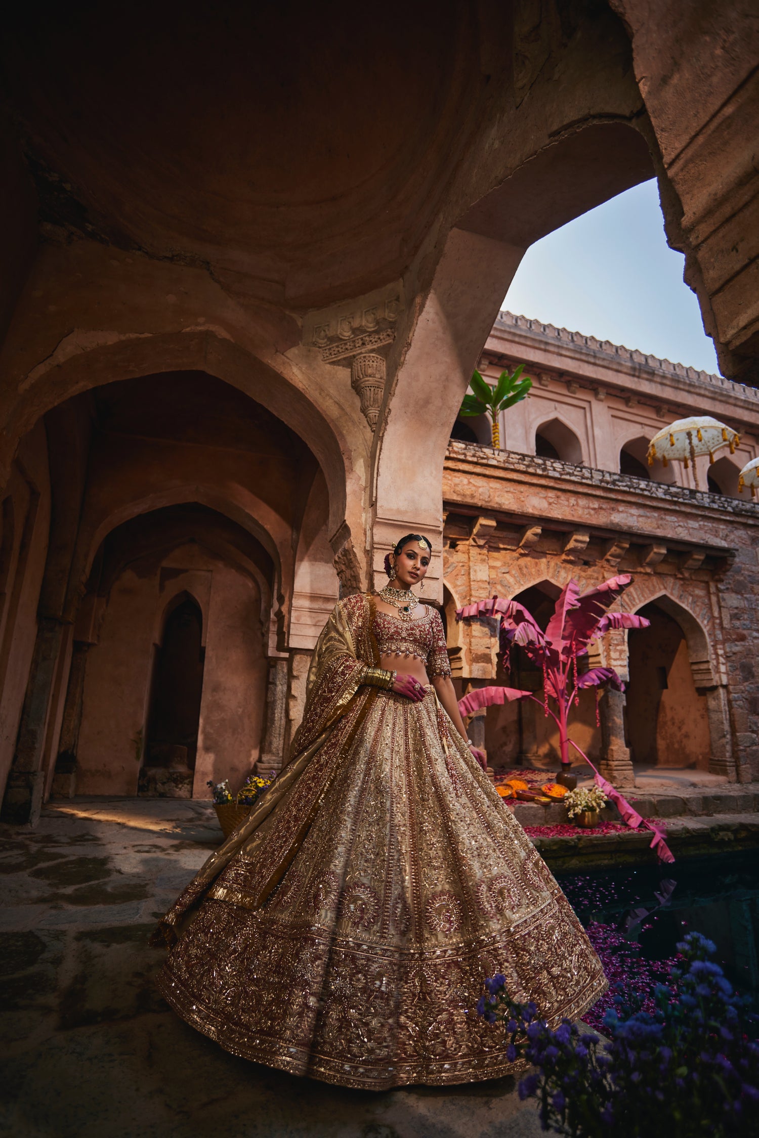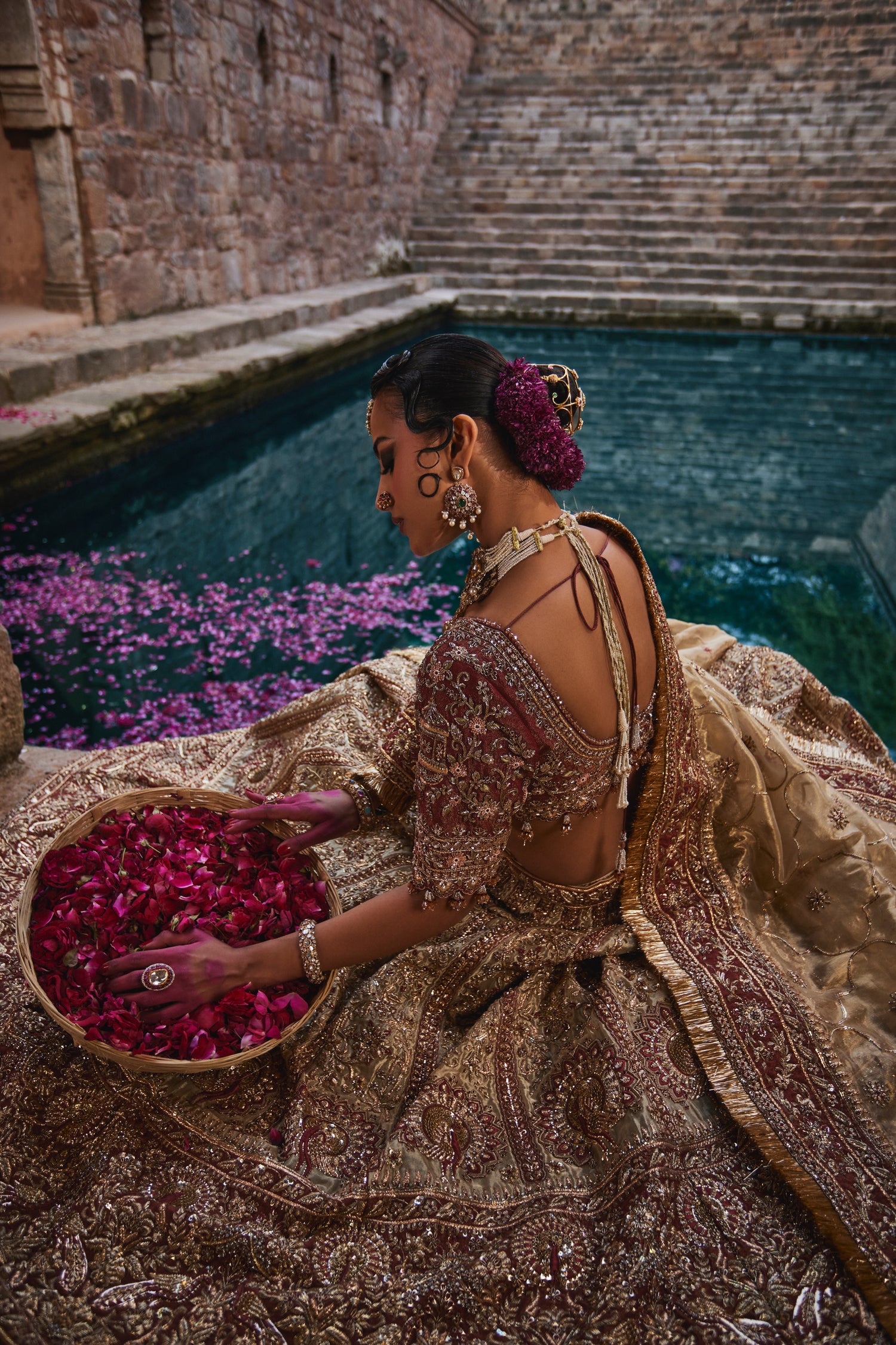 An ode to ceremonial grandeur, Swarn Pratha Lehenga is crafted in a radiant antique gold palette that reflects India’s royal wedding traditions. The lehenga features dense hand embroidery with intricate motifs, layered textures, and a luminous finish that captures light with every movement. Designed to flow with regal grace, this ensemble balances opulence and elegance, making it ideal for sacred pheras and heritage celebrations. A couture creation rooted in tradition, made for brides who seek timeless splendor.