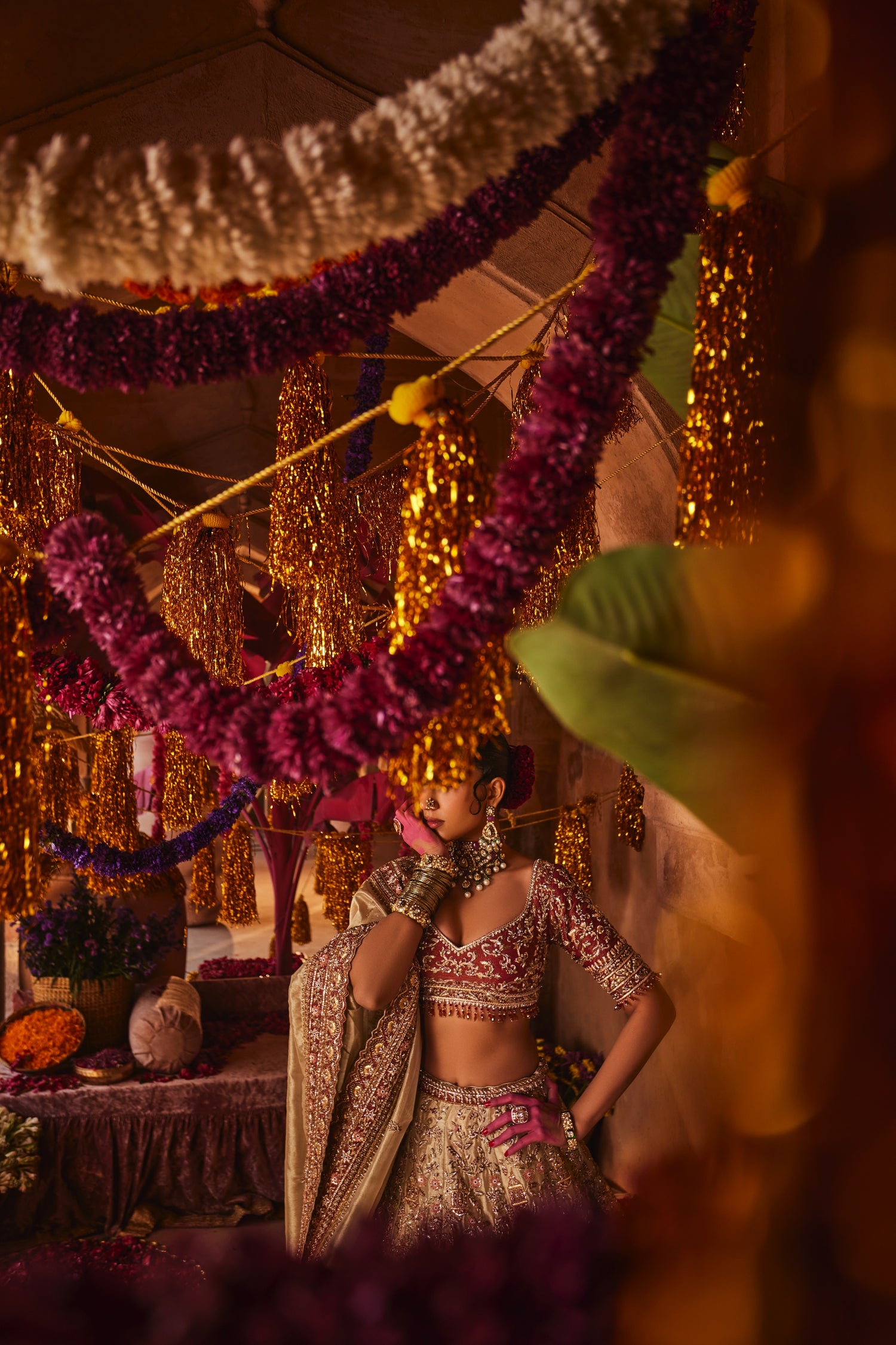 The lehenga is adorned with elaborate zardozi and hand embroidery, woven into traditional motifs that narrate stories of timeless artistry. Paired with a richly embellished blouse featuring a graceful neckline, the look feels powerful yet feminine. The dupatta, finished with detailed borders, drapes softly to complete this regal bridal silhouette.