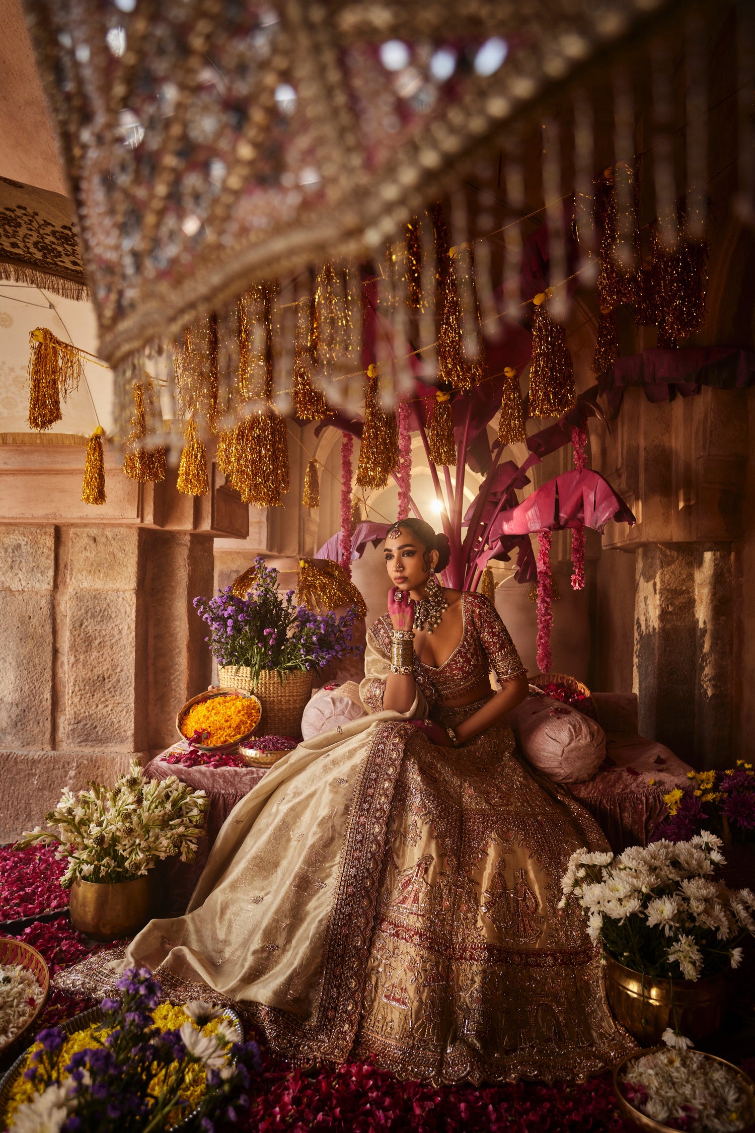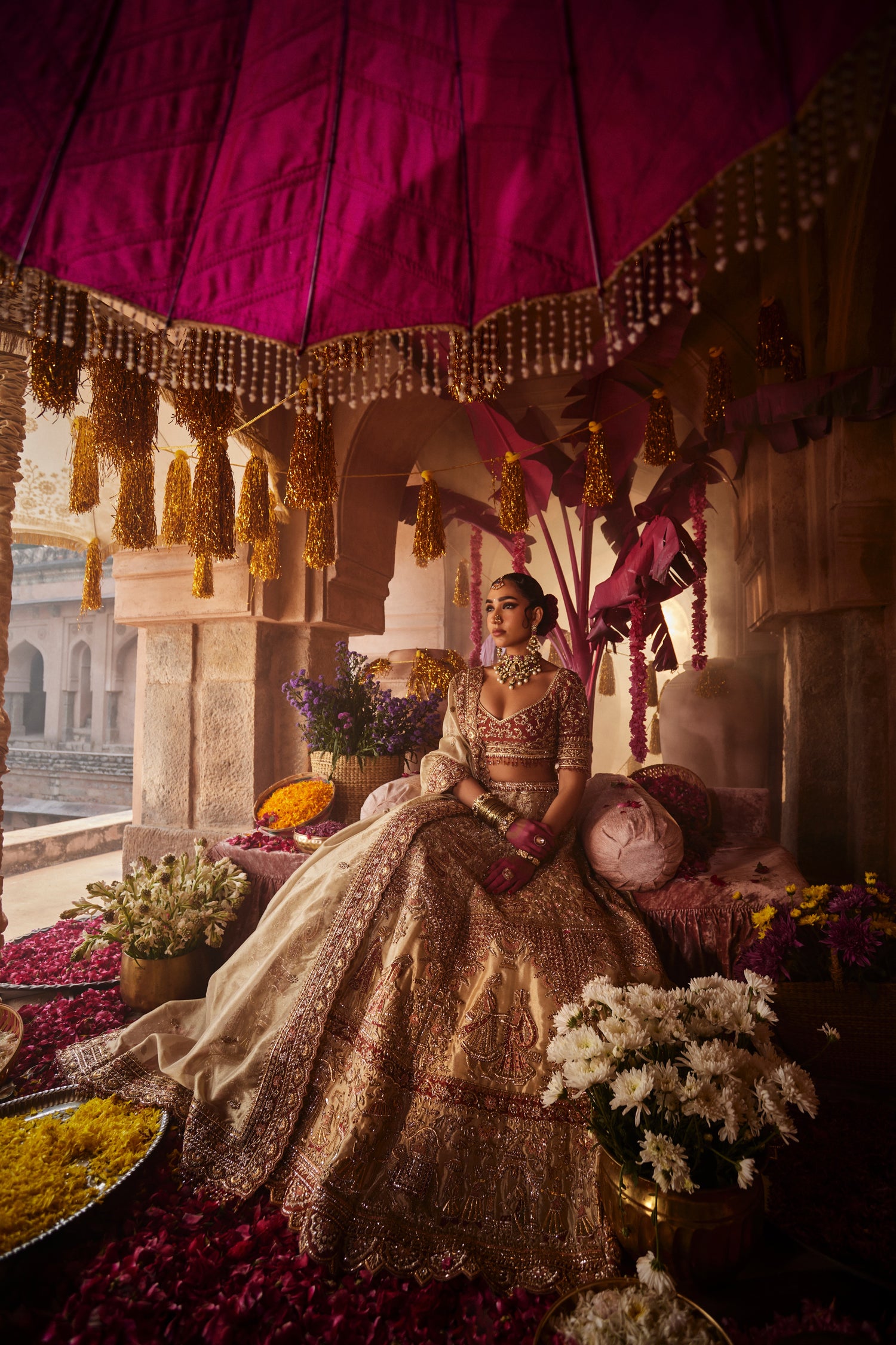 An ode to heritage and celebration, the Meher-e-Zeenat Zardozi Bridal Lehenga is crafted for the bride who carries tradition with quiet confidence. Set in a warm ivory-gold base, this ensemble reflects the richness of Indian weddings through intricate craftsmanship and soulful detailing.
